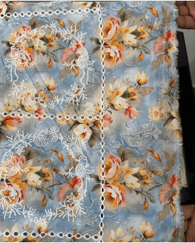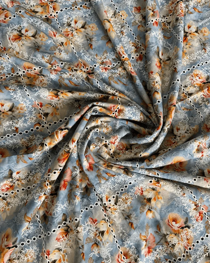• Exquisite Schiffli Embroidery: Fine white thread-work that adds a premium dimension to the floral print.