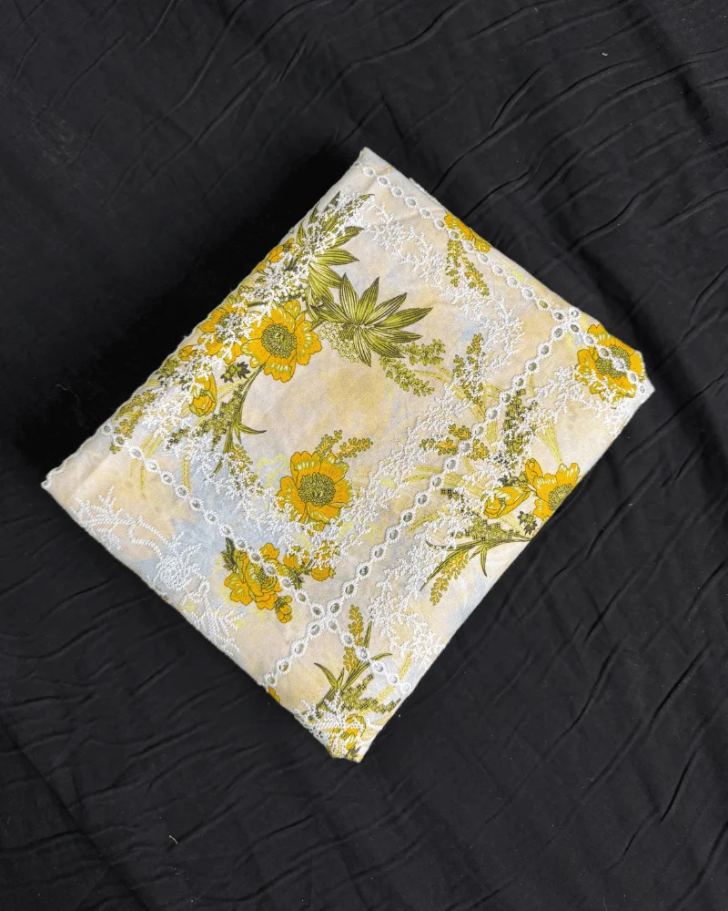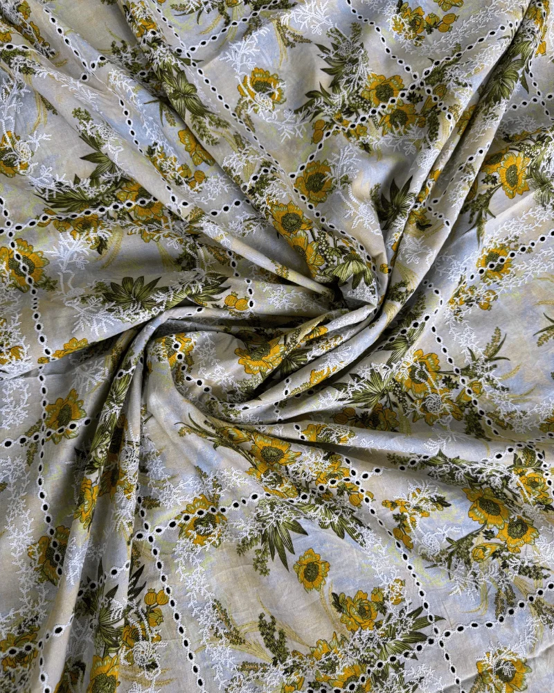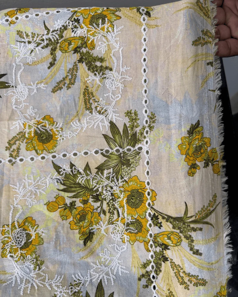 Exquisite Schiffli Embroidery: Fine white thread-work that adds a premium dimension to the floral print.