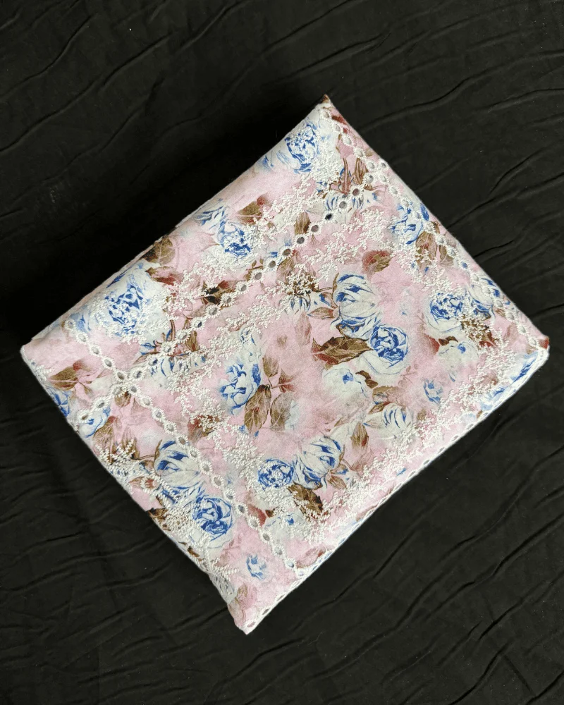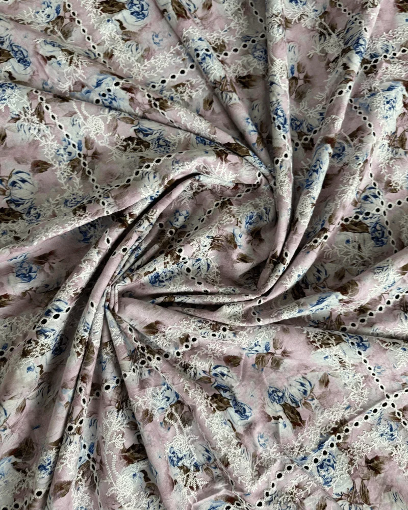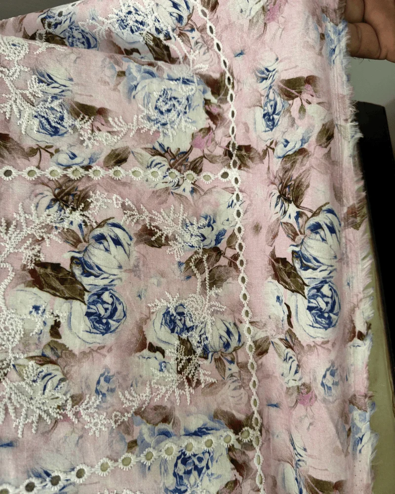 Exquisite Schiffli Embroidery: Fine white thread-work that adds a premium dimension to the floral print.