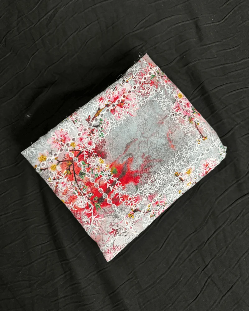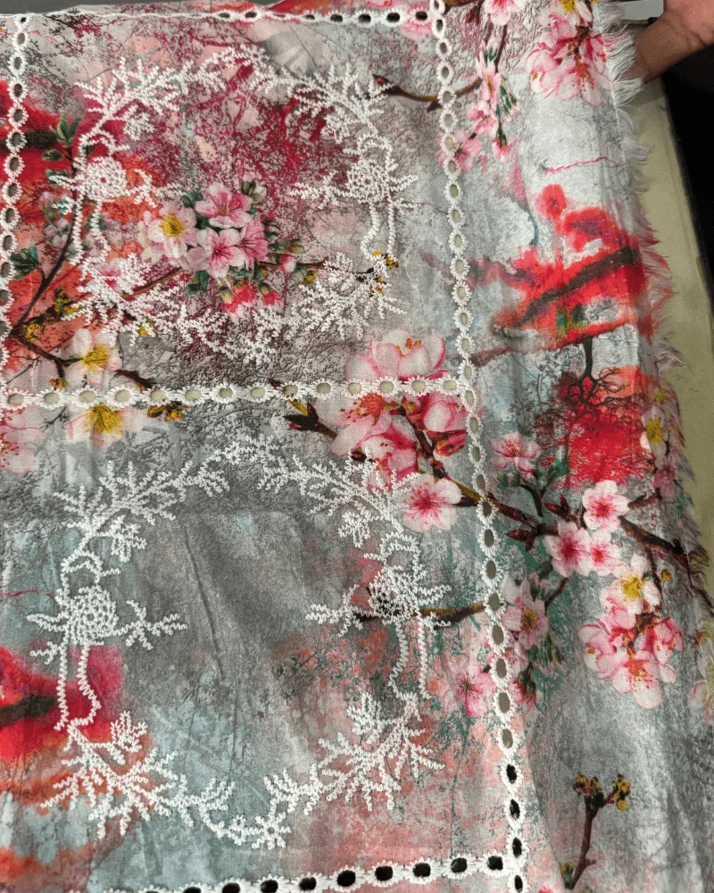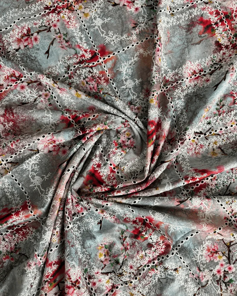 Exquisite Schiffli Embroidery: Fine white thread-work that adds a premium dimension to the floral print.