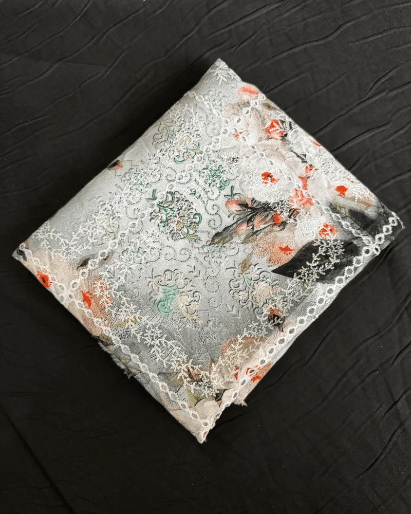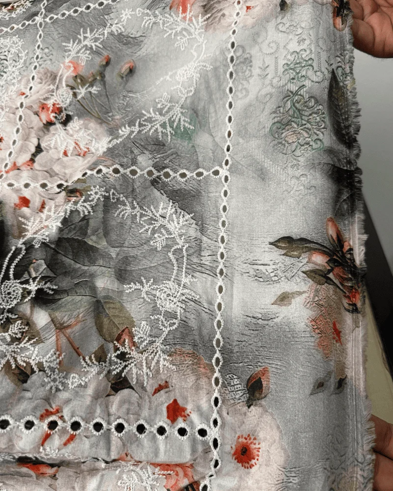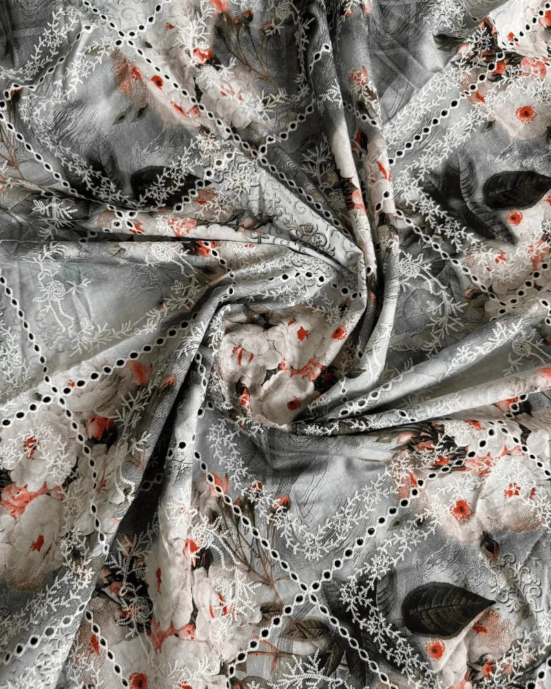 Exquisite Schiffli Embroidery: Fine white thread-work that adds a premium dimension to the floral print.