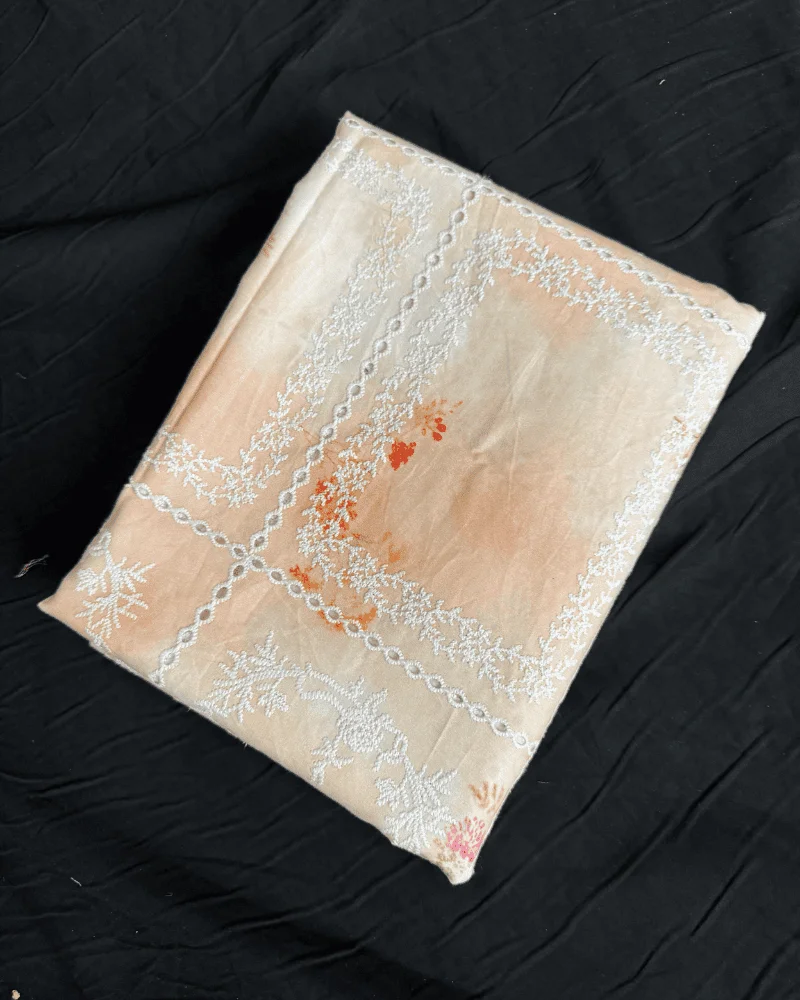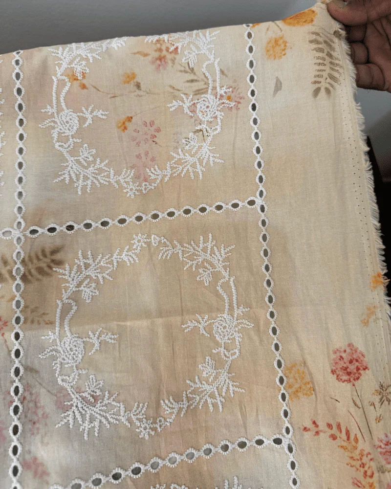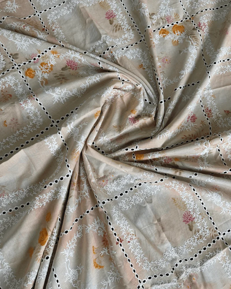 Exquisite Schiffli Embroidery: Fine white thread-work that adds a premium dimension to the floral print.