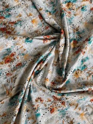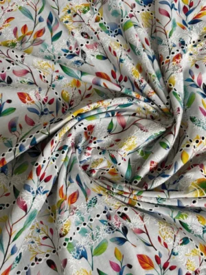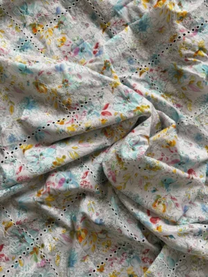 Color: Elegant Off-White base featuring a playful multi-color (Aqua, Yellow, Pink) floral print.