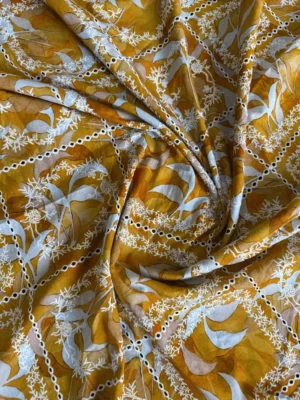 Color: Vibrant Mustard Yellow base with elegant white and beige leafy patterns.